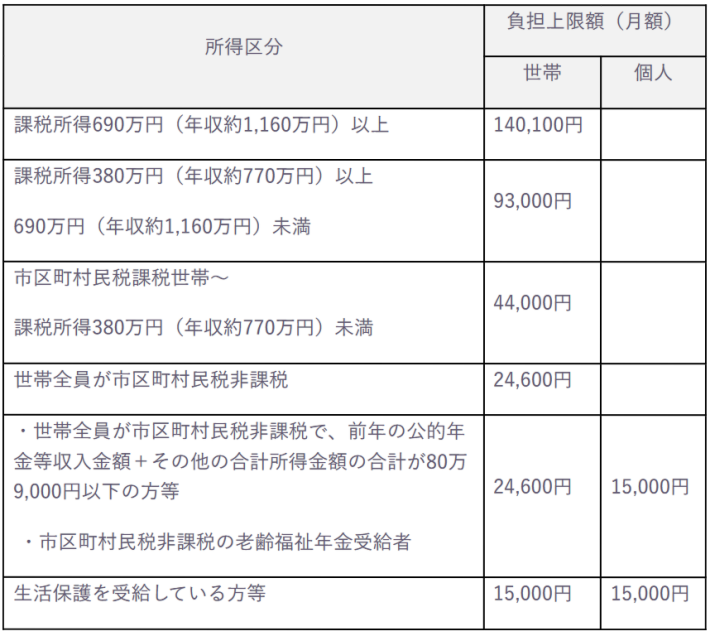 なお、負担上限額は世帯の所得区分によって異なり、具体的な金額は以下のとおりです。